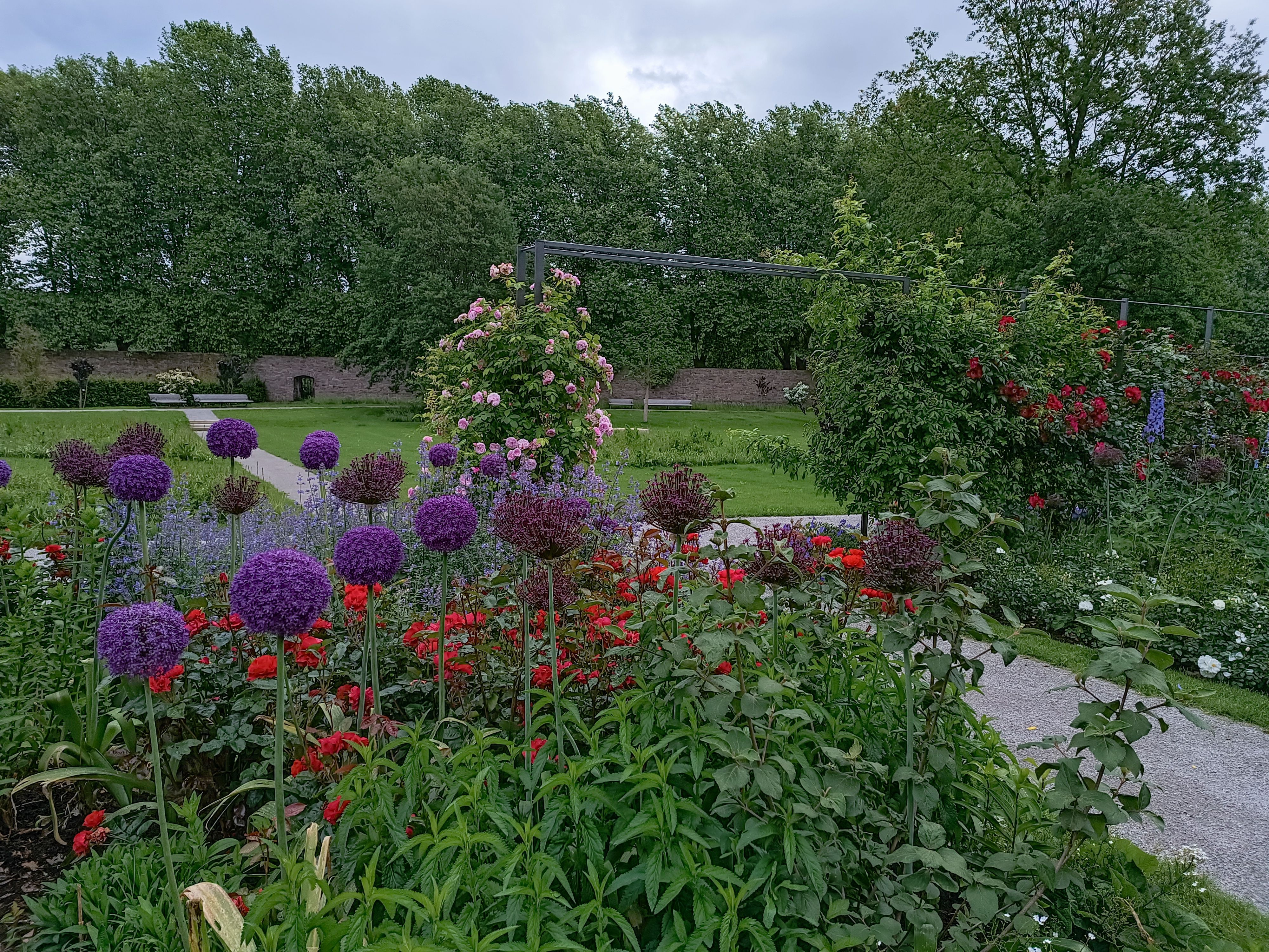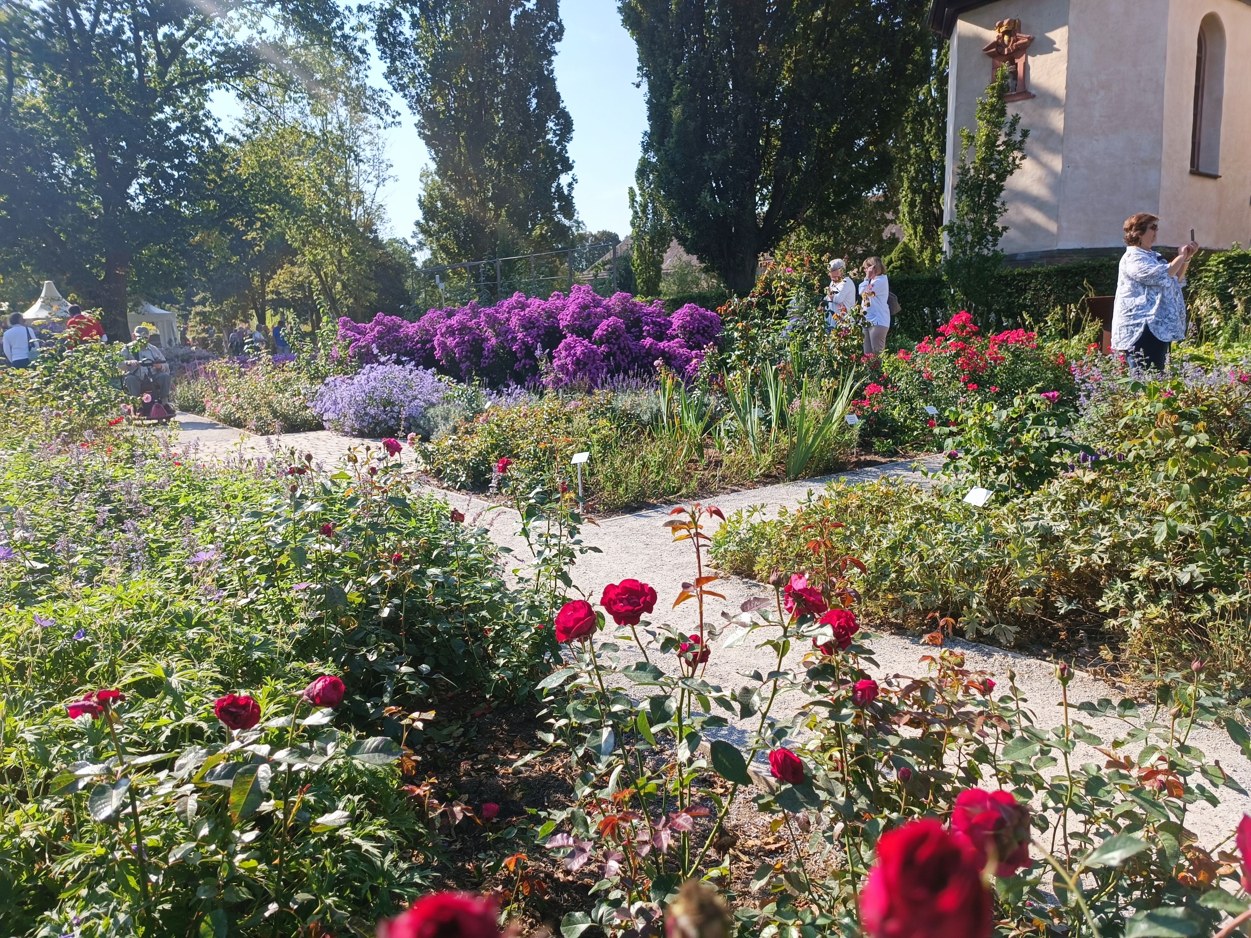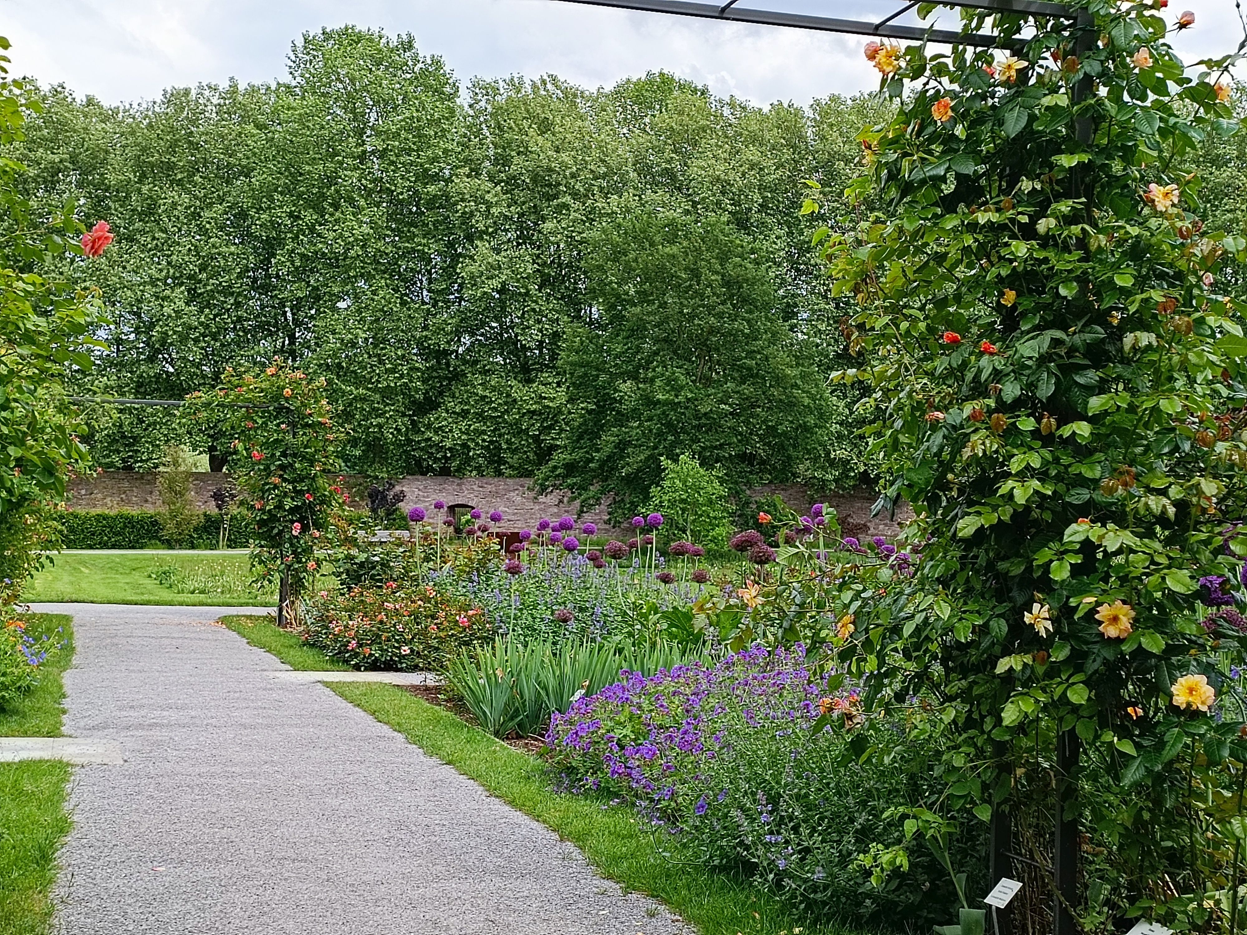 Rosenzeit zu Füßen des Welterbes: Der Rosengarten ist zu dieser Jahreszeit eine Augenweide. An den Bögen ranken sie sich in vielen Farben und Sorten vor der Kulisse von Barockschloss, Klostermauer und Domäne. Kunstvoll kombiniert sind die Rosen mit Stauden wie Rittersporn, Fingerhut, Salbei oder Indianernessel, die übrigens essbar ist. Stolze Lilien erheben sich und die saisonalen Wechselflorbeete stehen jetzt in voller Pracht.