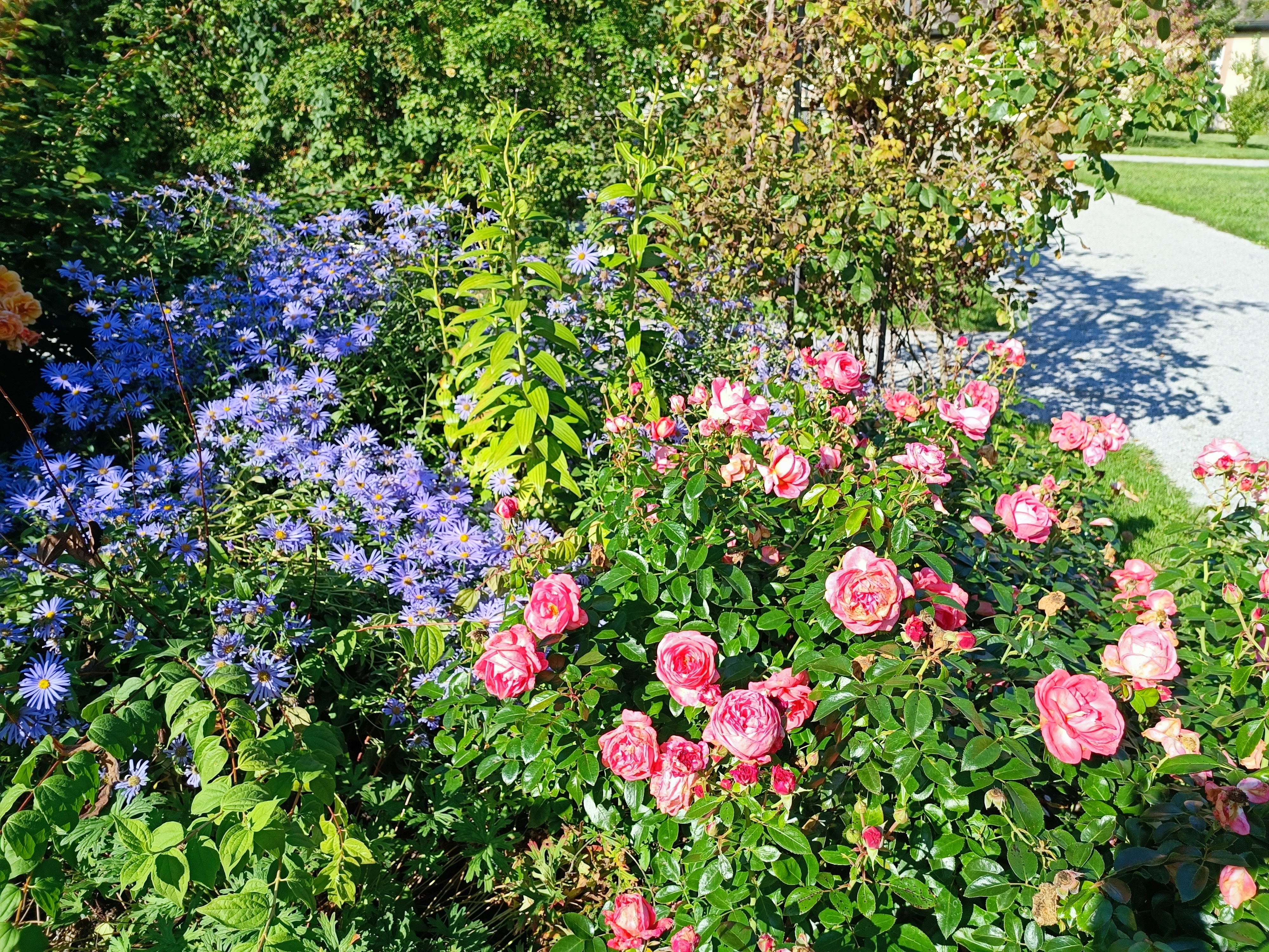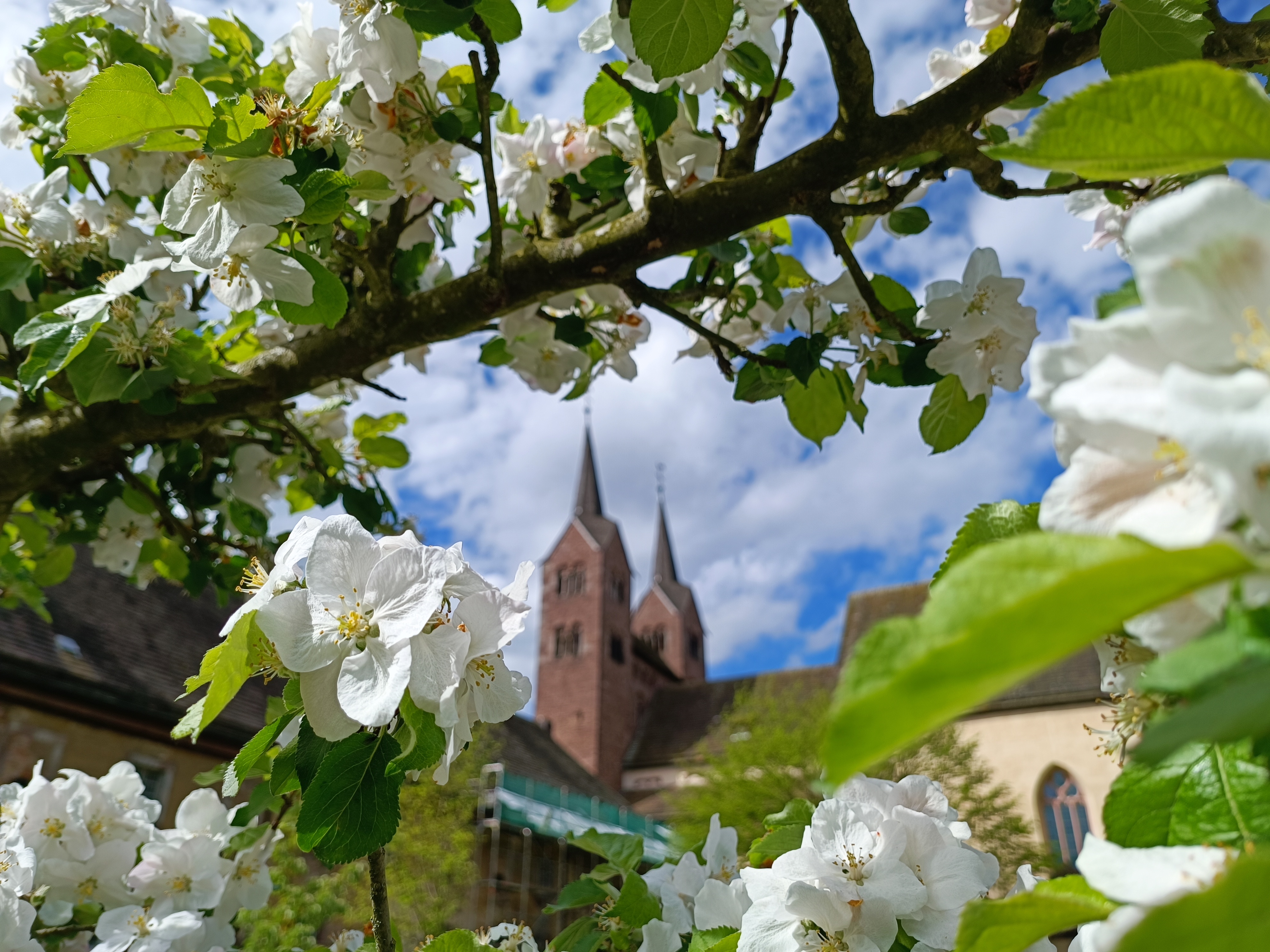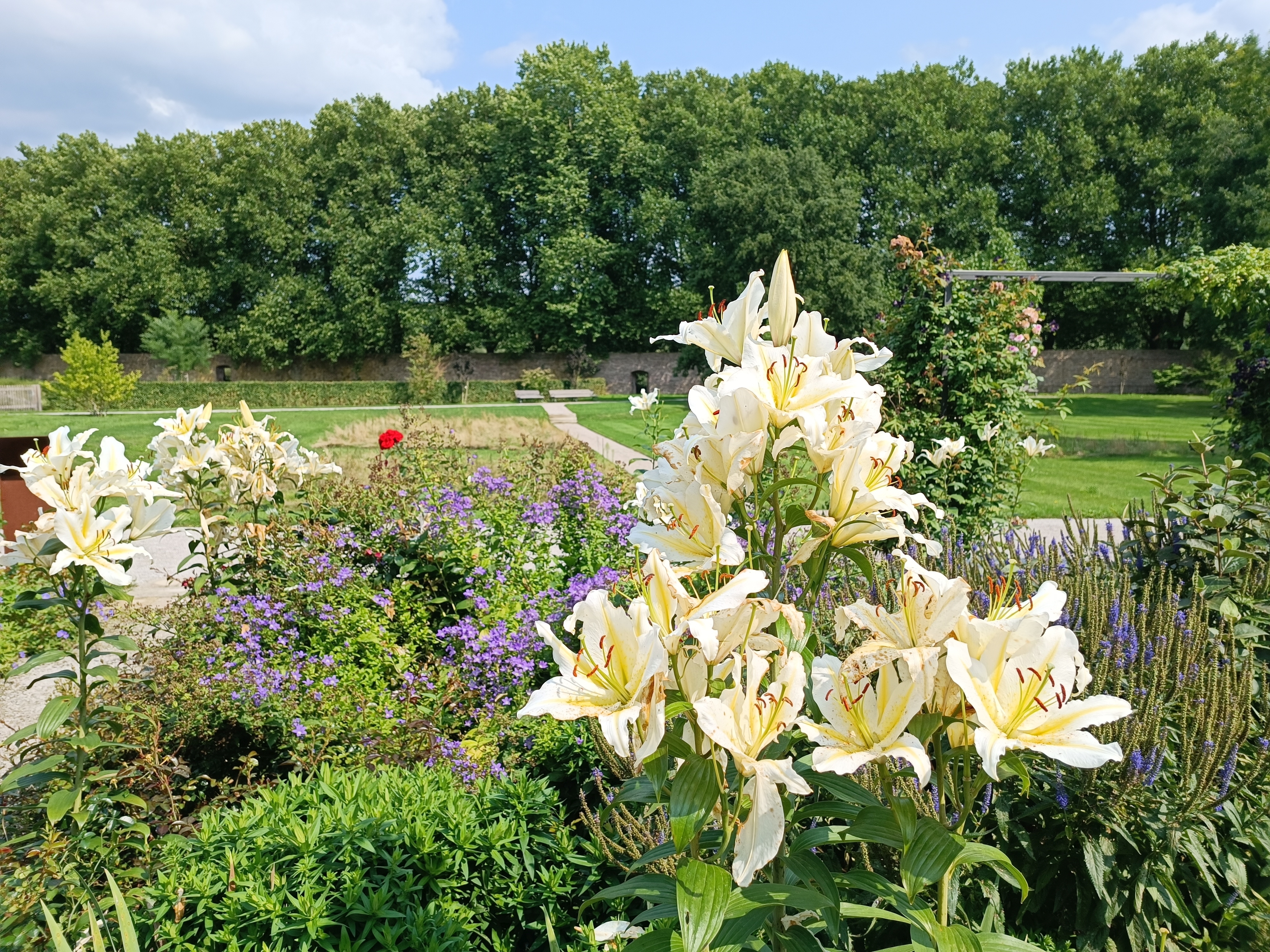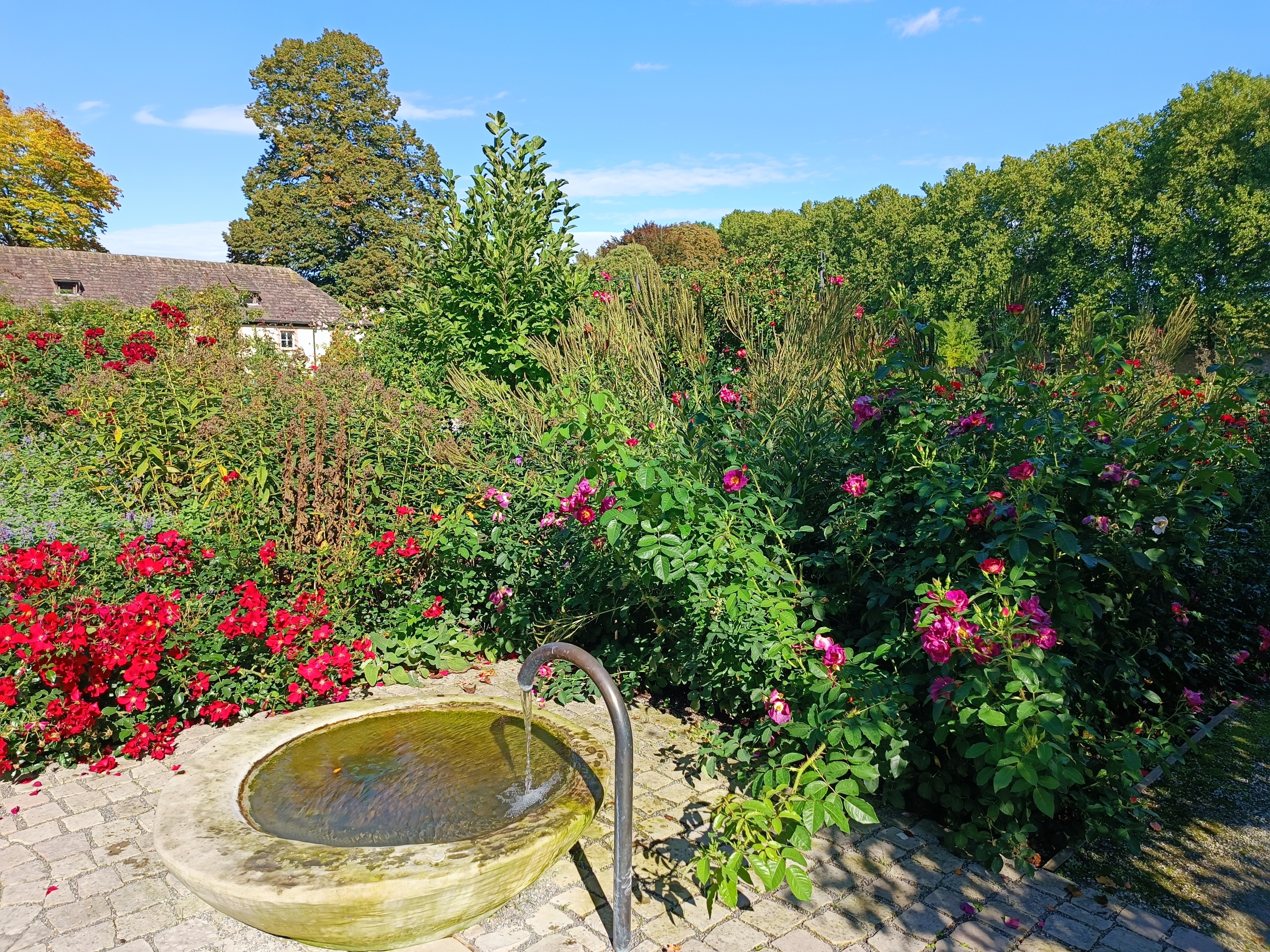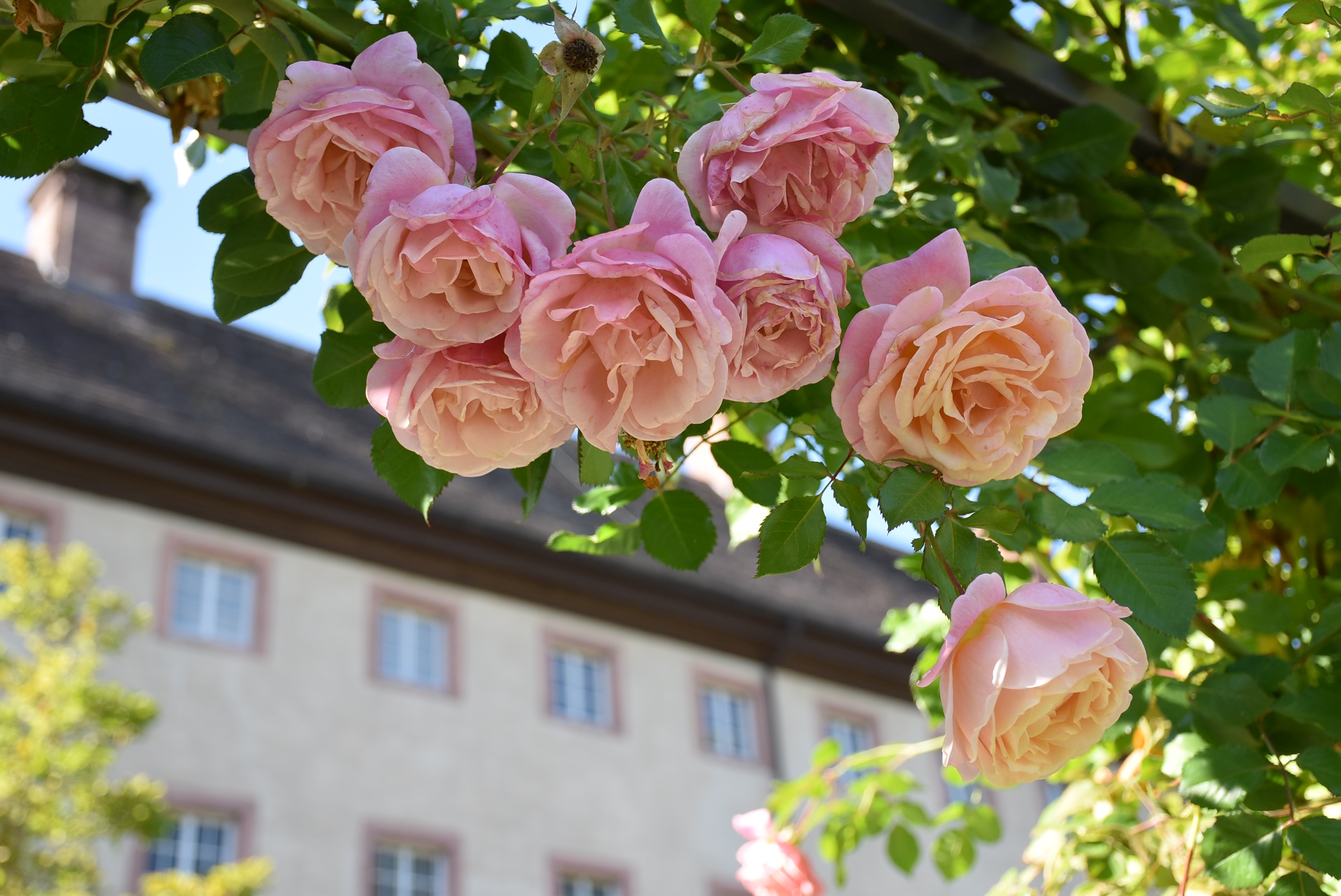 Rosenzeit zu Füßen des Welterbes: Der Rosengarten ist zu dieser Jahreszeit eine Augenweide. An den Bögen ranken sie sich in vielen Farben und Sorten vor der Kulisse von Barockschloss, Klostermauer und Domäne. Kunstvoll kombiniert sind die Rosen mit Stauden wie Rittersporn, Fingerhut, Salbei oder Indianernessel, die übrigens essbar ist. Stolze Lilien erheben sich und die saisonalen Wechselflorbeete stehen jetzt in voller Pracht.