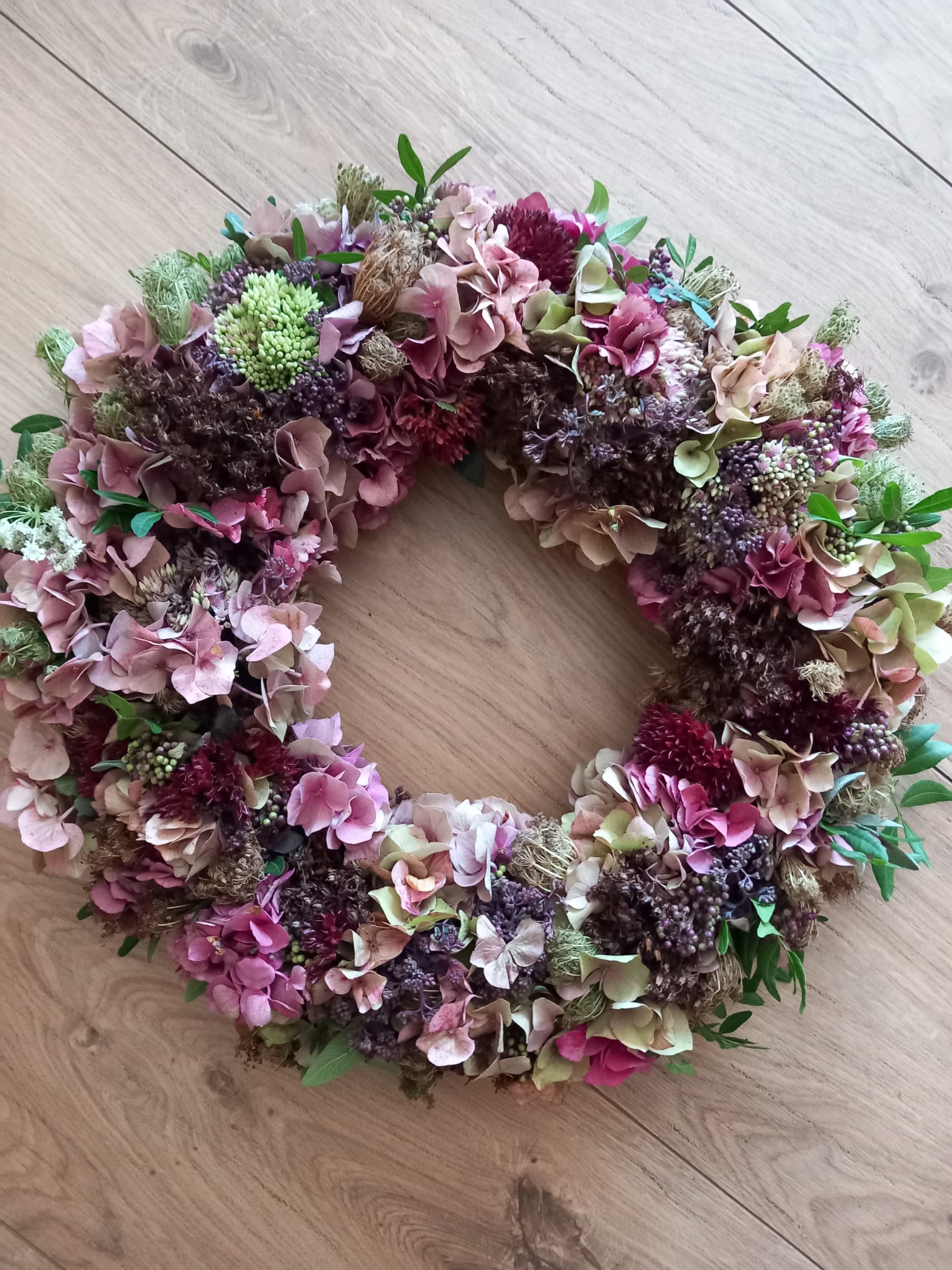 Verarbeitet werden unter anderem Fruchtstände von Stauden, Hagebutten, Gräser, frisches Grün und weitere saisonale Elemente.